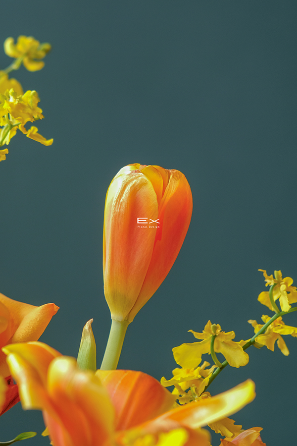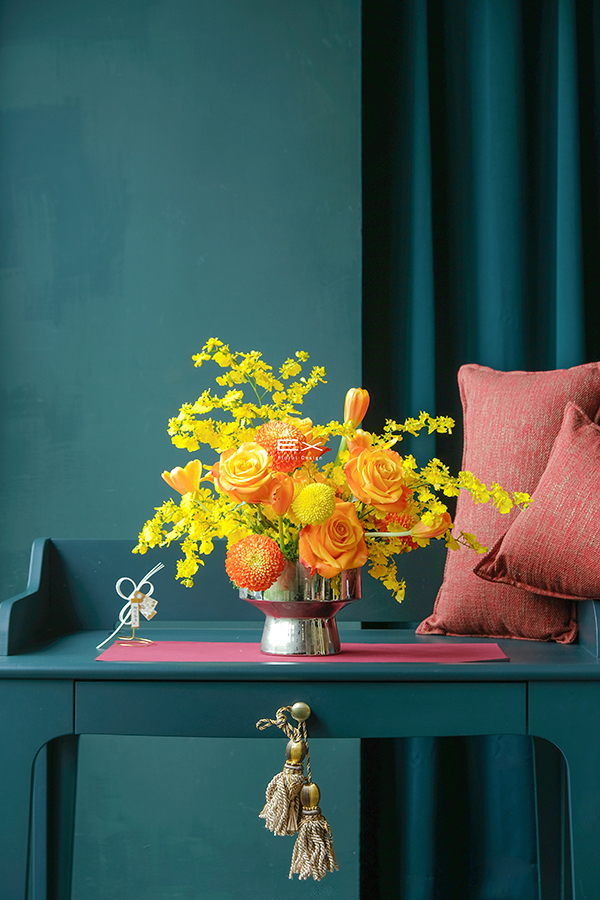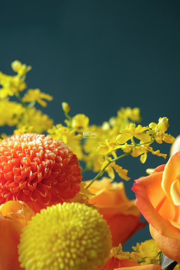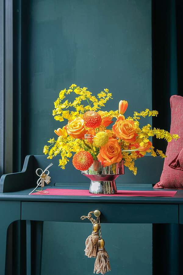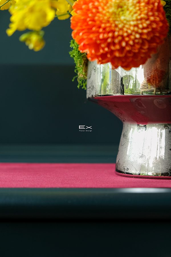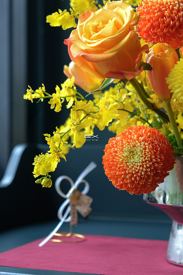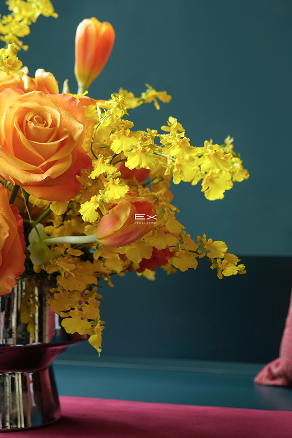 柔和的黃橘色花材,如同夕陽輕輕映照在桌面,帶來溫暖而高雅的氣息