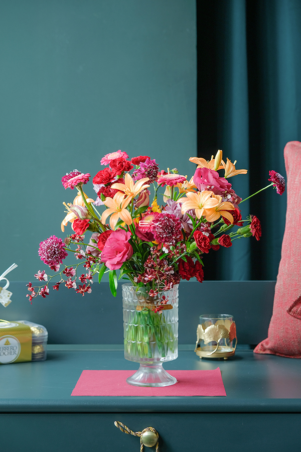 紅色花材層層鋪展,象徵財運啟動