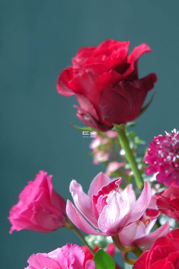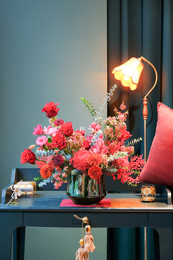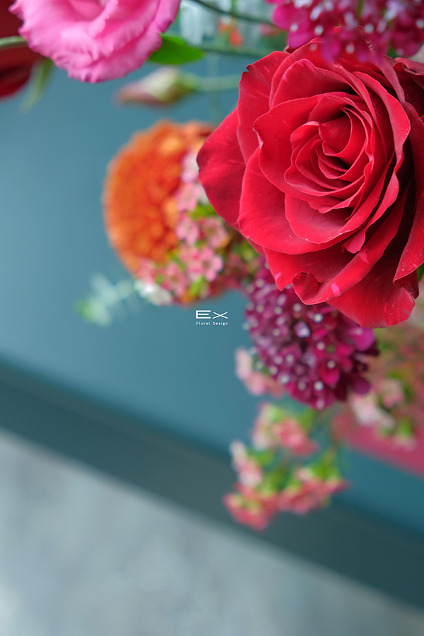 以層層紅色花材堆疊