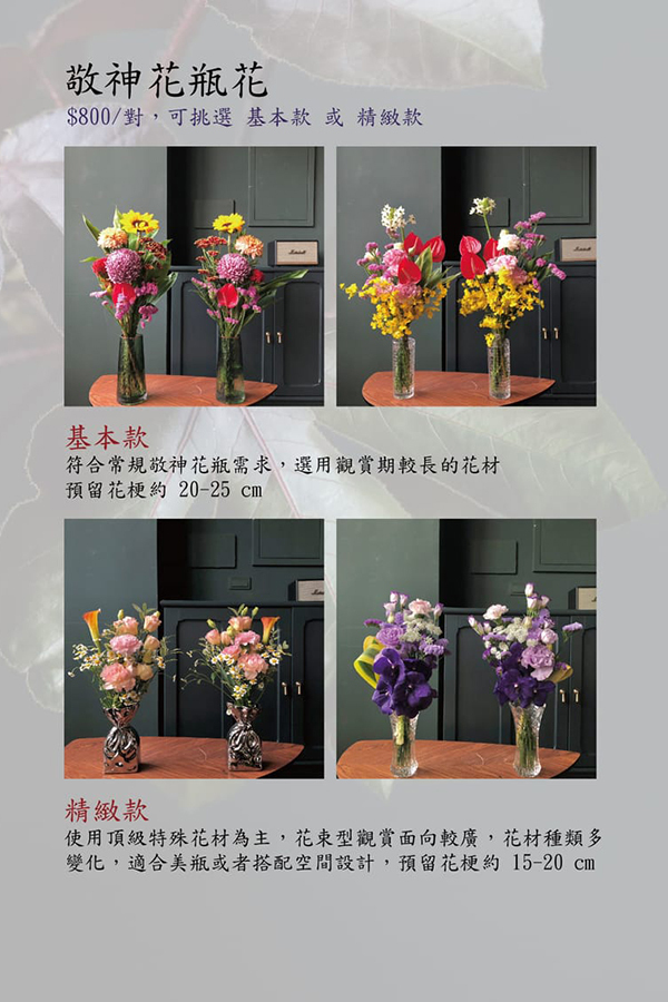符合常規敬神花瓶需求,選用觀賞期較長的花材